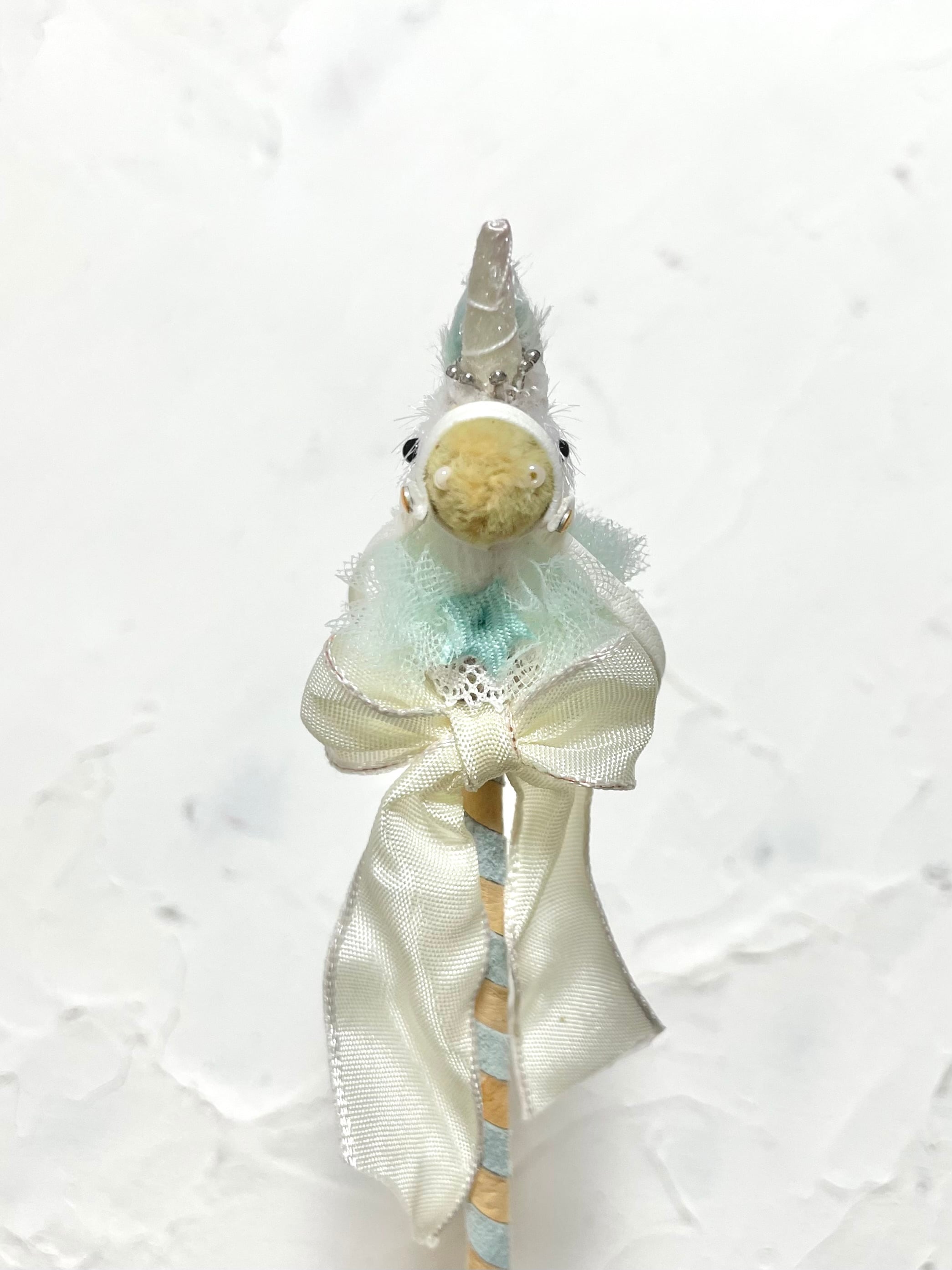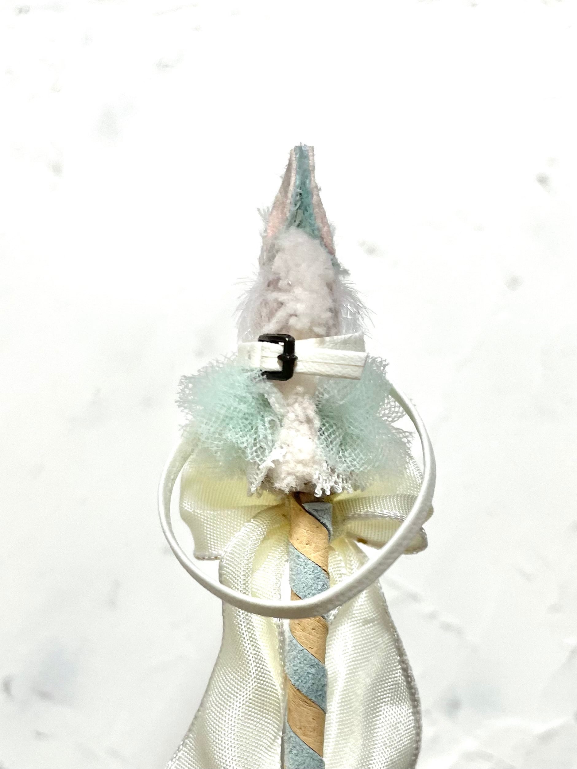 ①縫製済みの頭部に耳や目鼻やチュールなど装飾して仕上げていく。