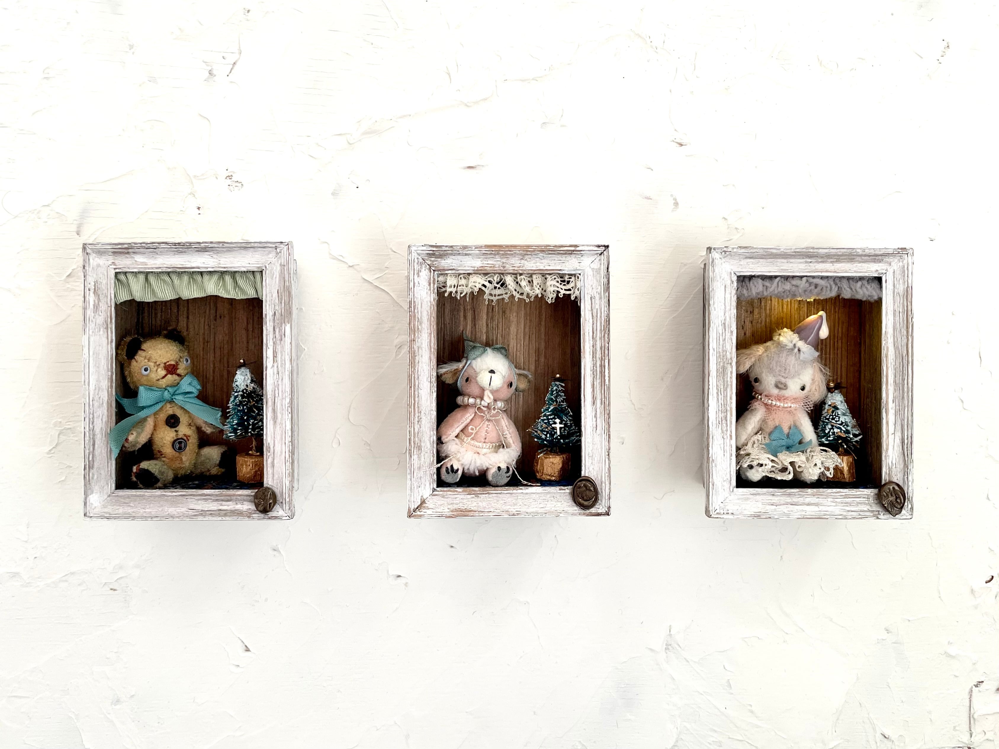 1/12〜1/6サイズのミニチュアぬいぐるみを、精巧な木製フレームボックスに納めました。