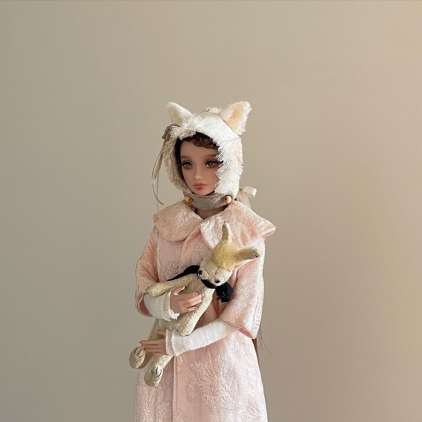縫製済みのボンネットに、耳を縫い付けてレースや布花、ビーズなどで装飾します。仕上げにペンやパステルで着彩も可能です。