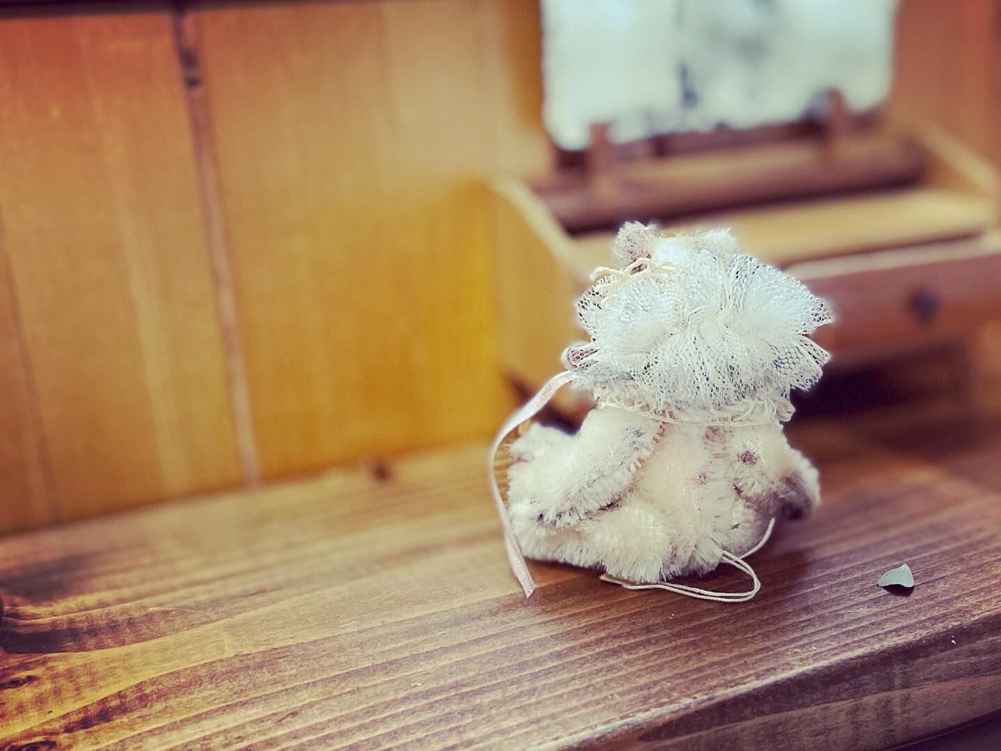 素材:モヘア、ウルトラスエード、グラスアイ、ビーズ、刺繍糸、アンティークレース、シルクリボン ほか